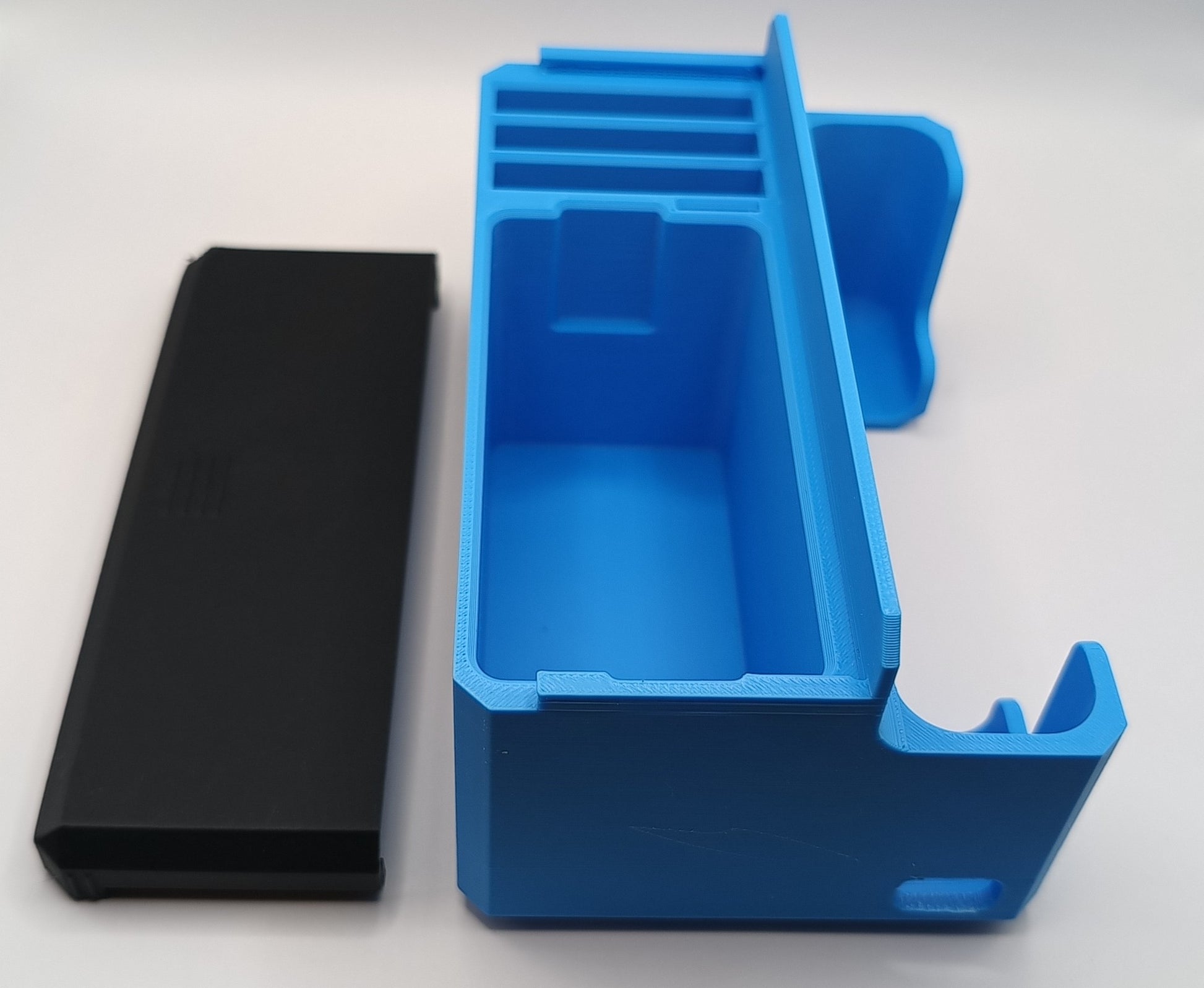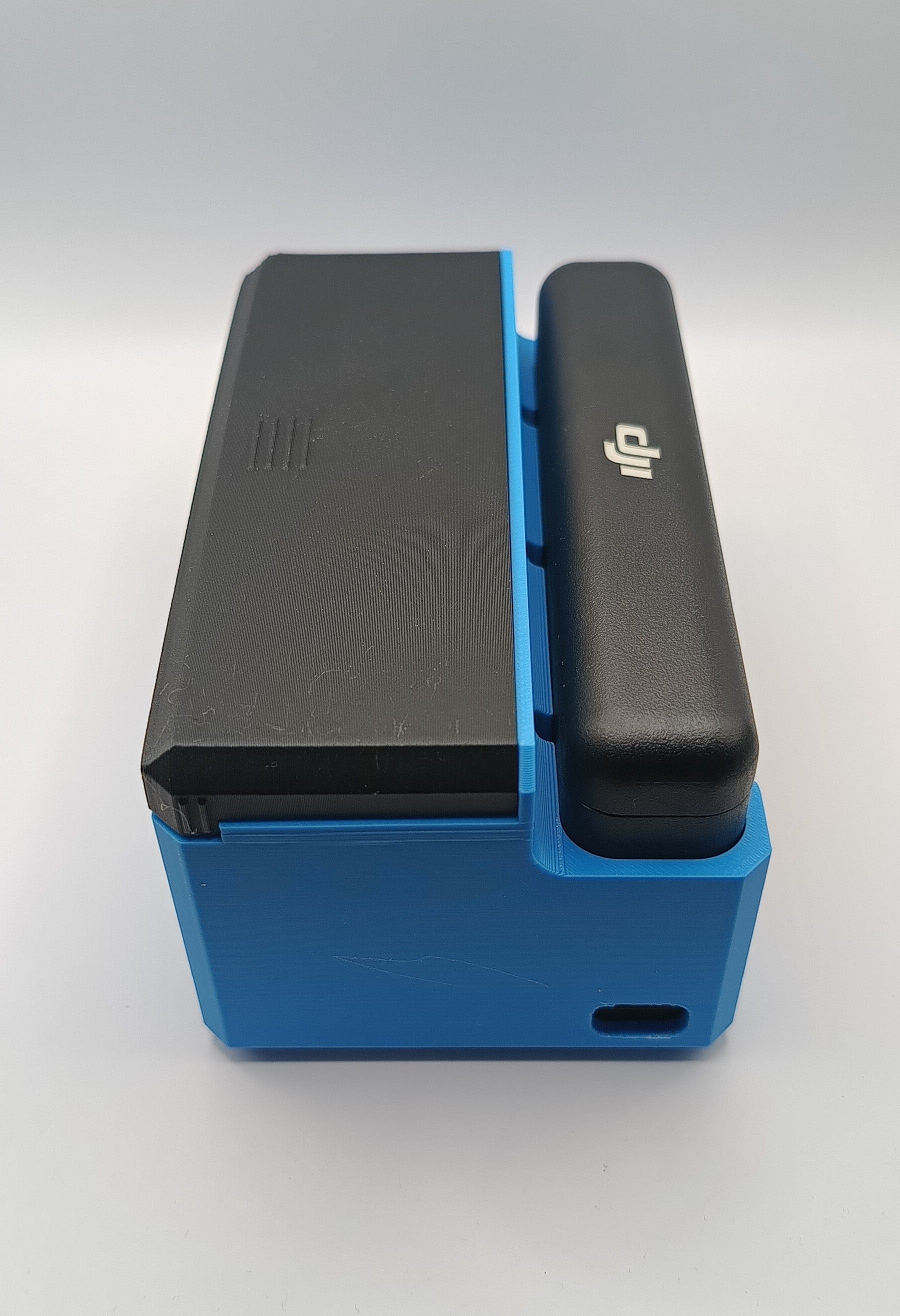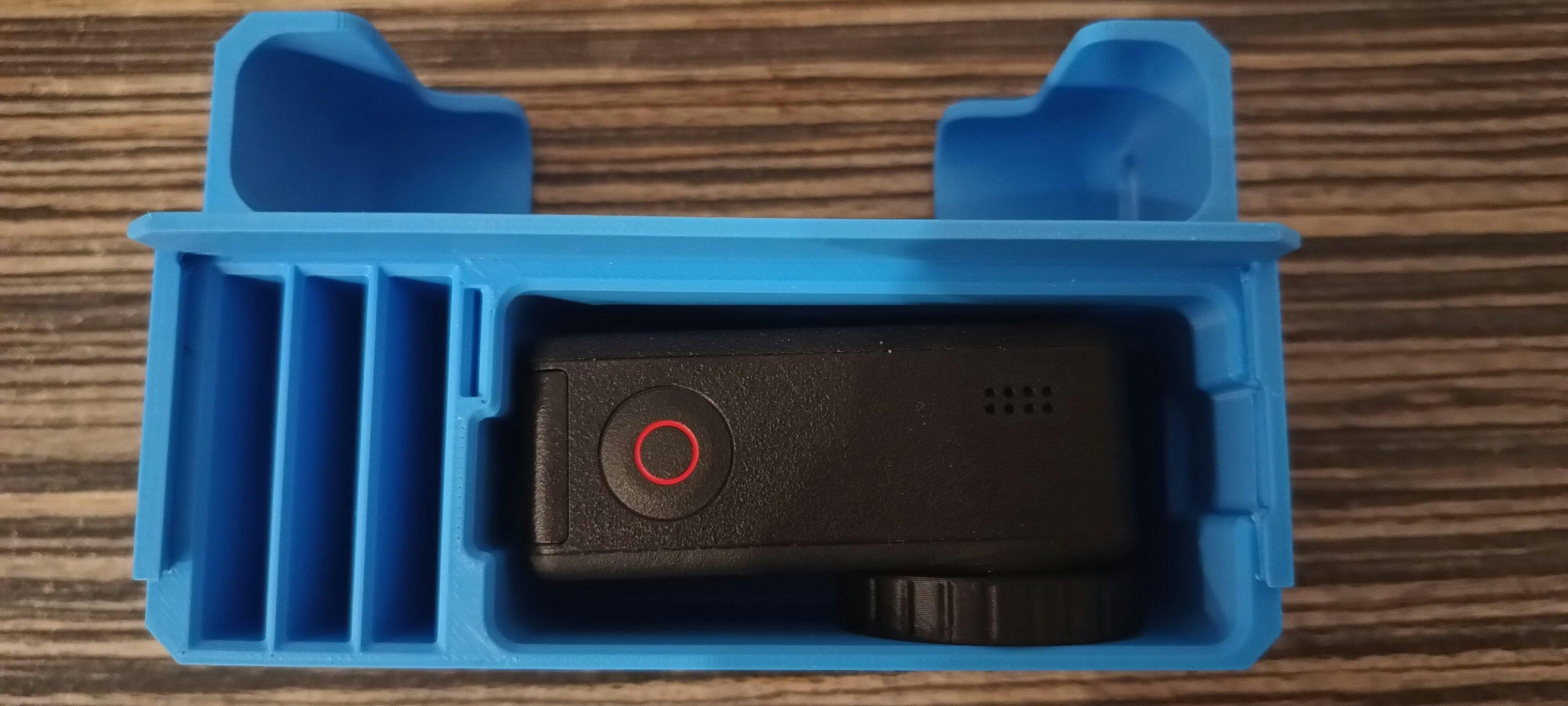 Cutie de depozitare realizată prin imprimare 3D, concepută pentru organizarea și protecția accesoriilor camerei DJI Osmo Action Cam 4 sau 5. Permite depozitarea camerei, cablurilor, cardului de memorie și a dispozitivului de încărcare pentru 3 baterii, într-un singur loc, sigur și ușor de transport.